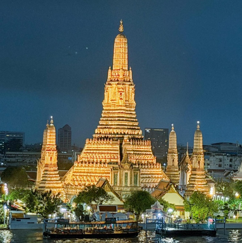 [이곳은 이런 곳!] 짜오프라야 강(Chao Phraya River) 건너편에 우아하게 솟아 있는 **왓 아룬(새벽 사원)**은 섬세한 도자기 조각들로 장식된 하얀 탑이 인상적인 사원입니다. 특히 해 질 녘 노을에 물드는 왓 아룬의 야경은 그야말로 환상적이며, 수많은 여행자들의 '인생샷' 명소로 사랑받고 있습니다. 2025년에는 등대 타워가 리뉴얼되어 더욱 멋진 전망을 제공하고 있습니다.